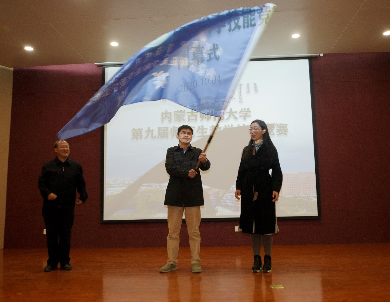 我院已连续承办两届竞赛,今年的赛事在我院师生共同努力下圆满落幕,内蒙古师范大学师范生教学技能竞赛赛旗交接仪式,由第九届师范生教学技能竞赛承办单位我院院院长米俊魁教授将竞赛赛旗交接于第十届师范生教学技能竞赛承办单位数学科学学院副院长包霞教授、教务处处长韩巍教授。