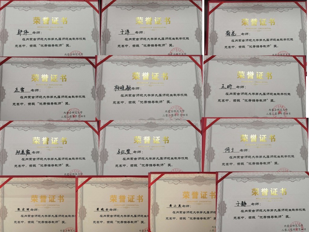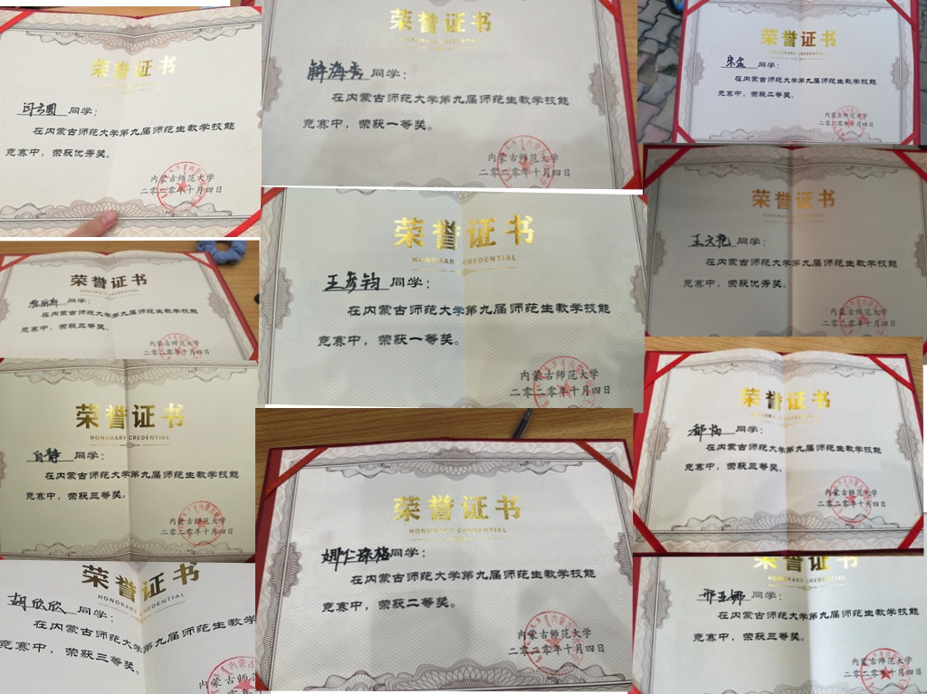 我院学生积极参加比赛,在大赛中脱颖而出,喜获佳绩,我院多位指导教师获“优秀指导教师”荣誉称号,充分展现了教育学院师范生培养的实力与水平。我院解海秀、屈佳乐、王彦钧荣获一等奖,马卉坤、赵佳、李成龙、娜仁珠格、宋金、杨牧原荣获二等奖,胡欣欣、维丽斯、邢亚娜、刘可欣、白静、都临荣获三等奖,闫方圆、张荣荣、王文艳荣获优秀奖。黄小英老师、张宏丽老师、菊花老师、郭伟老师、何士老师、张美霞老师、马红斐老师、于静老师、王昕老师、翟晓云老师、杨晓敏老师、于洋老师、左雪老师获“优秀指导教师”荣誉称号。我院还获得“优秀组织将”荣誉称号。
