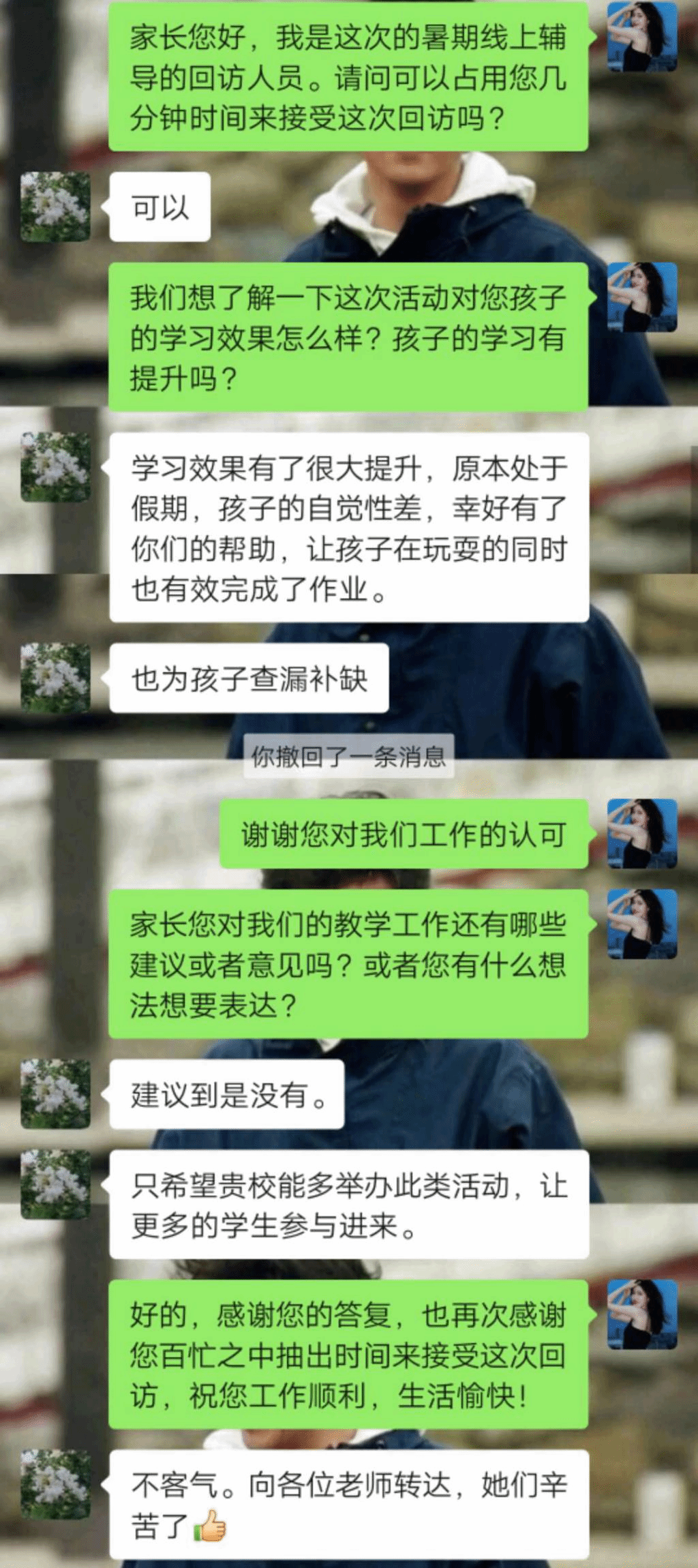 回访过程中,家长们积极配合,对教学工作给出了反馈。家长们普遍反映自己的孩子通过本次活动收获了很多知识,解决了许多学习上存在的问题,养成了好的学习习惯。除此之外,家长们对此次教学工作的灵活安排与实施给予了很好的评价,对教学活动中老师认真负责的态度和踏实仔细的辅导给予了肯定。家长们也为本次活动提出了宝贵的建议,有利于更好的完善实际的教学工作。