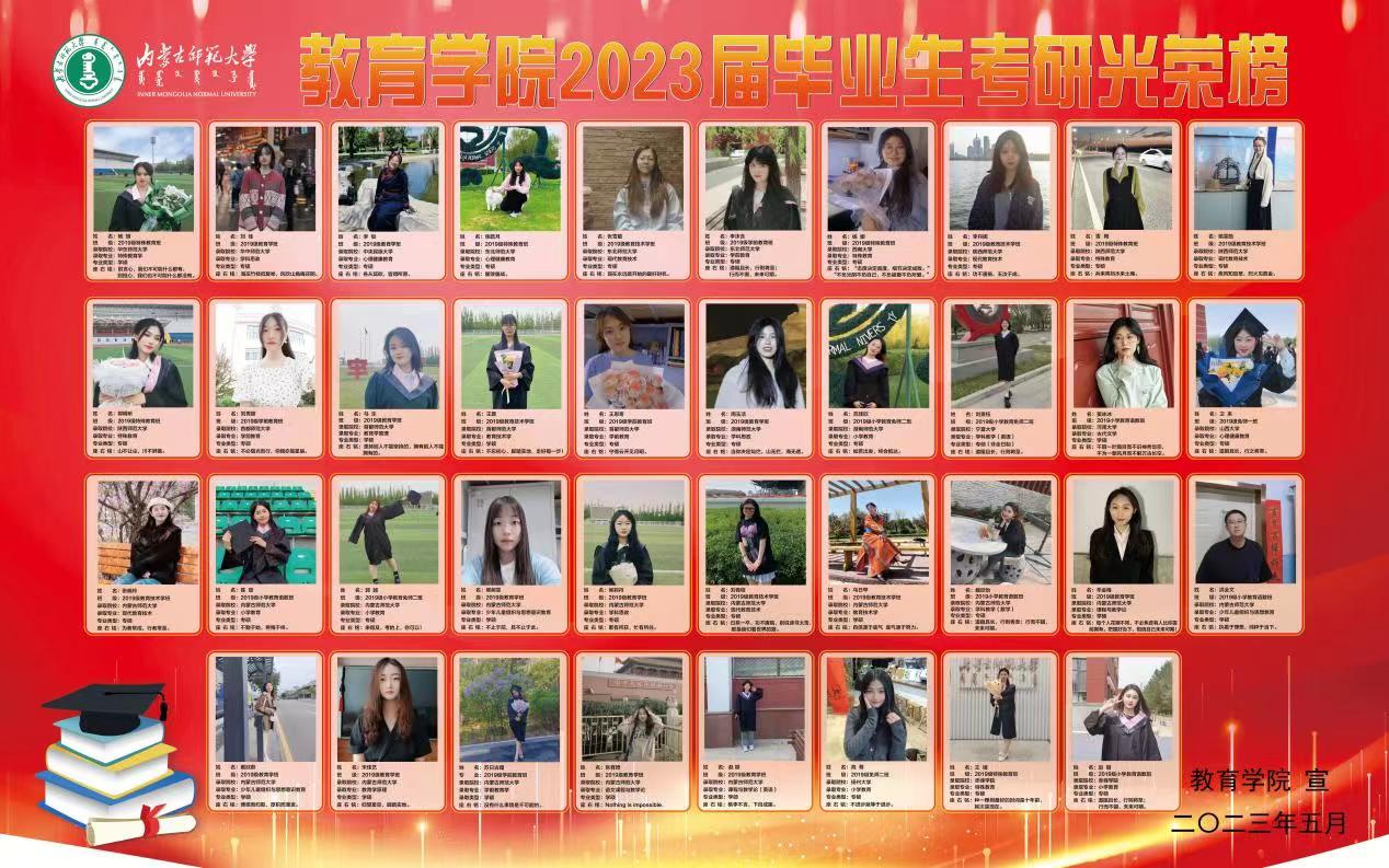 在2023届全国硕士研究生招生考试中,教育学院2019级学子录取喜报频传,共有38人考入心仪的学校。其中,学硕12人,专硕26人。通过不懈努力,学子们考取了华东师范大学、华中师范大学、中央民族大学、东北师范大学、西南大学、陕西师范大学、首都师范大学、湖南师范大学、内蒙古师范大学等区内外知名高校。